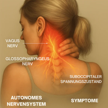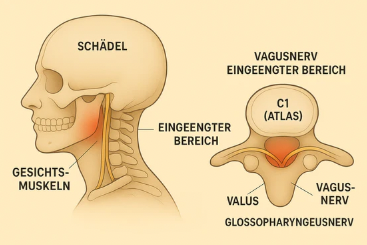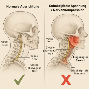 Dadurch entsteht Druck auf den Vagusnerv und den Glossopharyngeusnerv – jene Nerven, die Verdauung, Herzrhythmus und Gleichgewicht steuern.