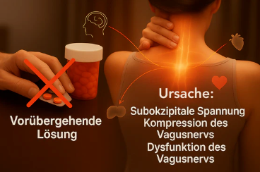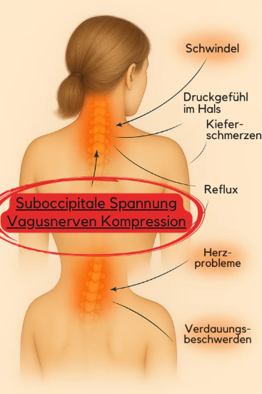 Anstatt dass Signale frei fließen, entsteht ein „Nervenstau“, der Symptome wie Sodbrennen, Migräne, Schwindel, Druck im Hals oder Herzrhythmusstörungen auslösen kann.