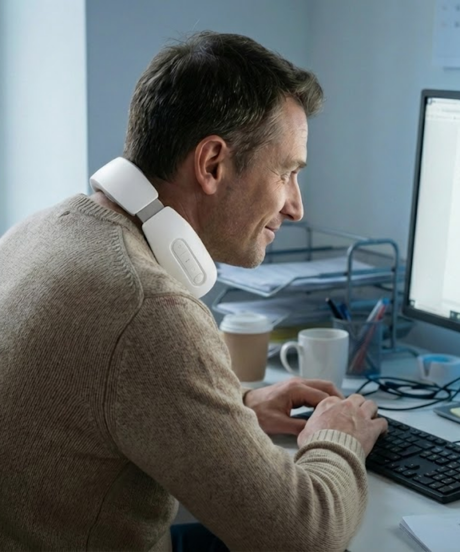 Gezielte EMS-Impulse aktivieren tief liegende Muskelgruppen im Nacken, die im Alltag kaum genutzt werden – wie ein sanftes Training, ganz ohne eigene Anstrengung.