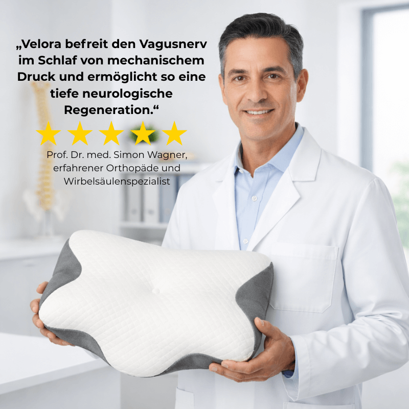Durch die ergonomische Form bleibt dein Nacken natürlich ausgerichtet, die Atmung kann freier erfolgen und dein Nervensystem kommt leichter zur Ruhe. Statt Druck und Abknicken unterstützt Velora eine entspannte Schlafposition – für ruhigere Nächte und ein erholteres Aufwachen.
